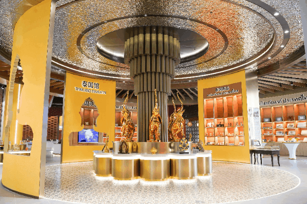 泰國館展示有多種獨(dú)具“泰味”的精美藝術(shù)品、特色食品、乳膠制品、化妝品、珠寶飾品、手工藝品等特色商品。