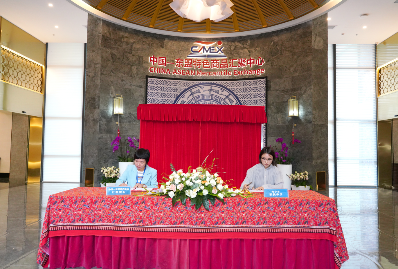 2023年10月10日,匯聚中心又吸引了南寧市第二中學(xué)、南寧市新民中學(xué)學(xué)生綜合實踐研學(xué)基地落戶,并圓滿舉辦了簽約和揭牌儀式。南寧市第二中學(xué)校區(qū)副校長曾晶、南寧市新民中學(xué)副校長關(guān)雪、中國—東盟特色商品匯聚中心副總經(jīng)理盧春梅、中國—東盟特色商品匯聚中心副總經(jīng)理李丹共同出席儀式。