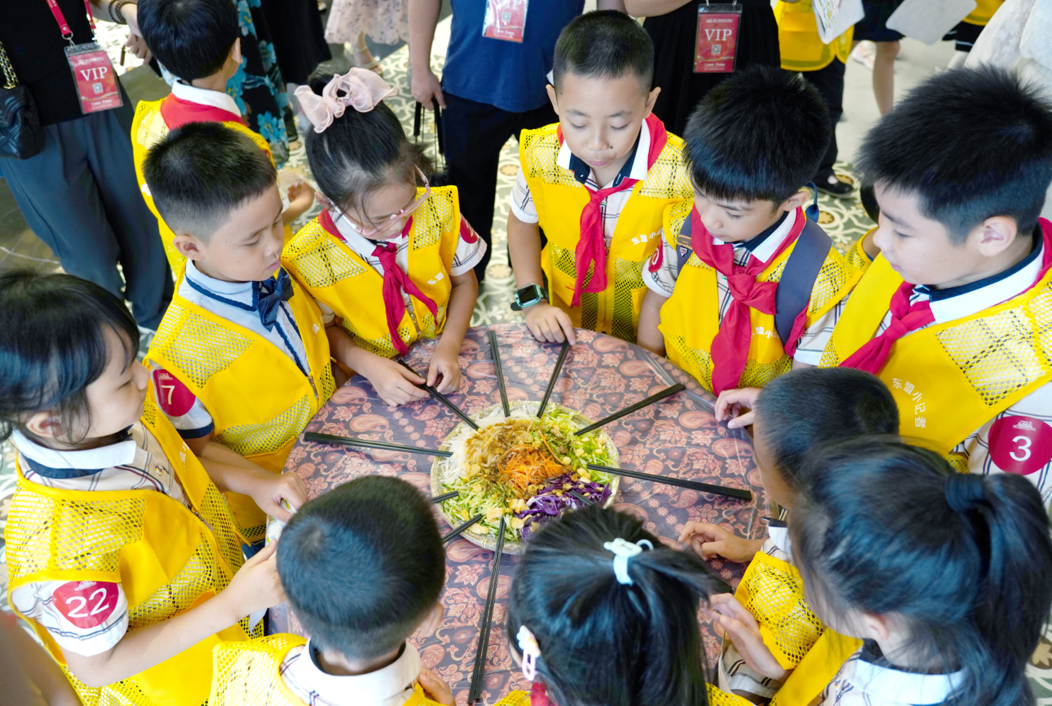 在馬來(lái)西亞館,東盟“小記者”們?cè)诂F(xiàn)場(chǎng)親身體驗(yàn)了地道的東南亞華人傳統(tǒng)習(xí)俗——“撈生”儀式,即把裝在盤子里的食材用筷子反復(fù)高高夾起,“撈”得越高,寓意越吉祥。通過(guò)趣味“撈生”,寄語(yǔ)孩子們學(xué)習(xí)更上一層樓、德智體美勞全面發(fā)展的美好愿望。