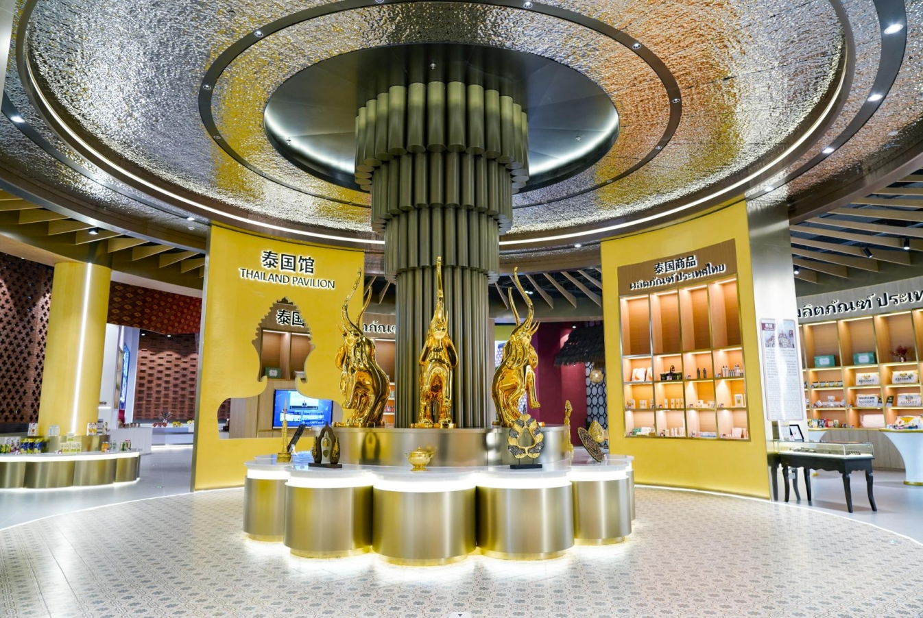 泰國館展示有多種獨(dú)具“泰味”的精美藝術(shù)品、特色食品、乳膠制品、化妝品、珠寶飾品、手工藝品等特色商品。