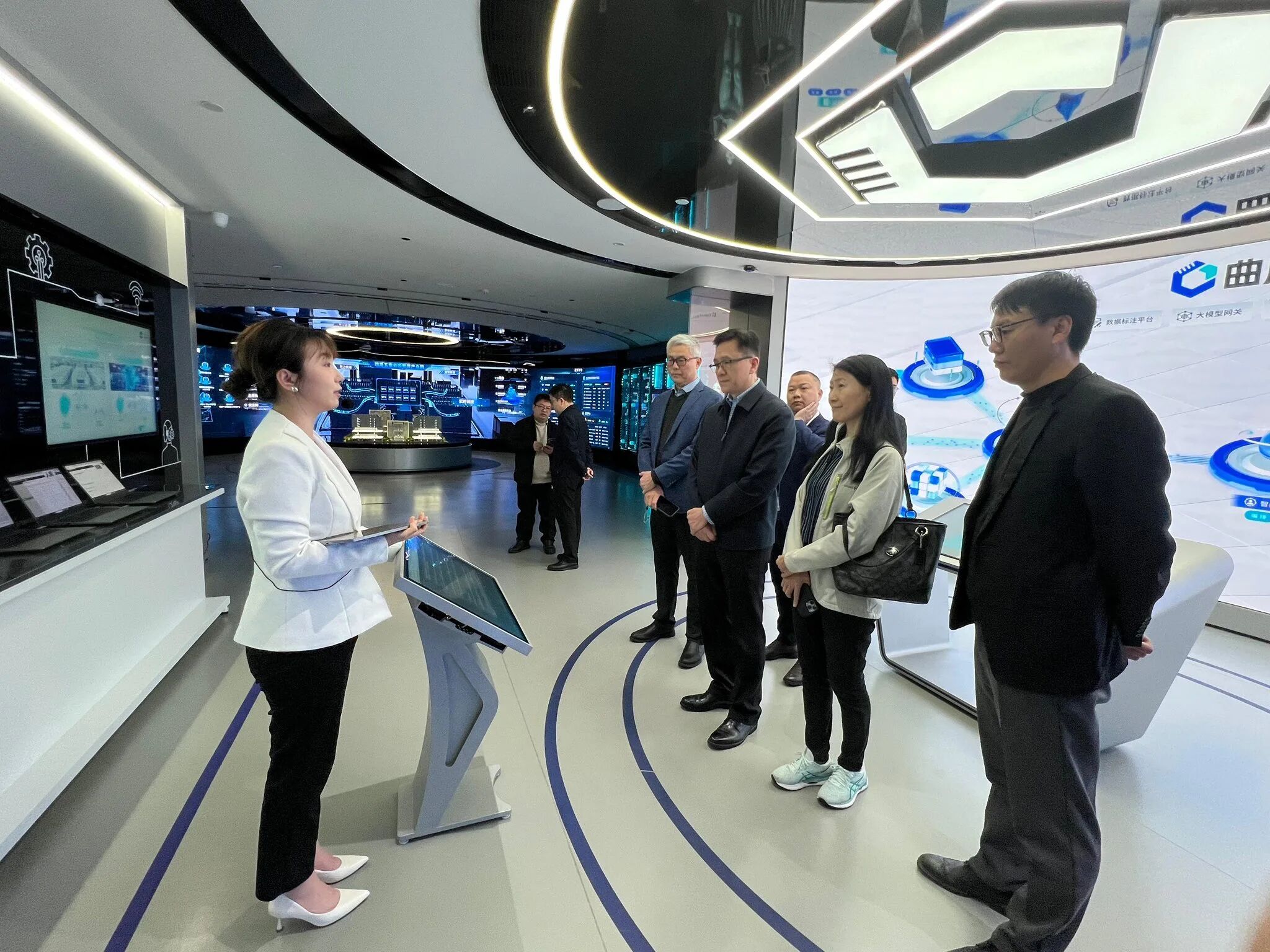 創(chuàng)新科技及工業(yè)局局長孫東教授(左二)在廣西到中國—東盟國家人工智能應(yīng)用合作中心展示中心調(diào)研,聽取該中心在建設(shè)營運,以及與東南亞國家聯(lián)盟國家合作情況的介紹。旁為香港數(shù)碼港管理有限公司行政總裁鄭松巖博士(右一)。
